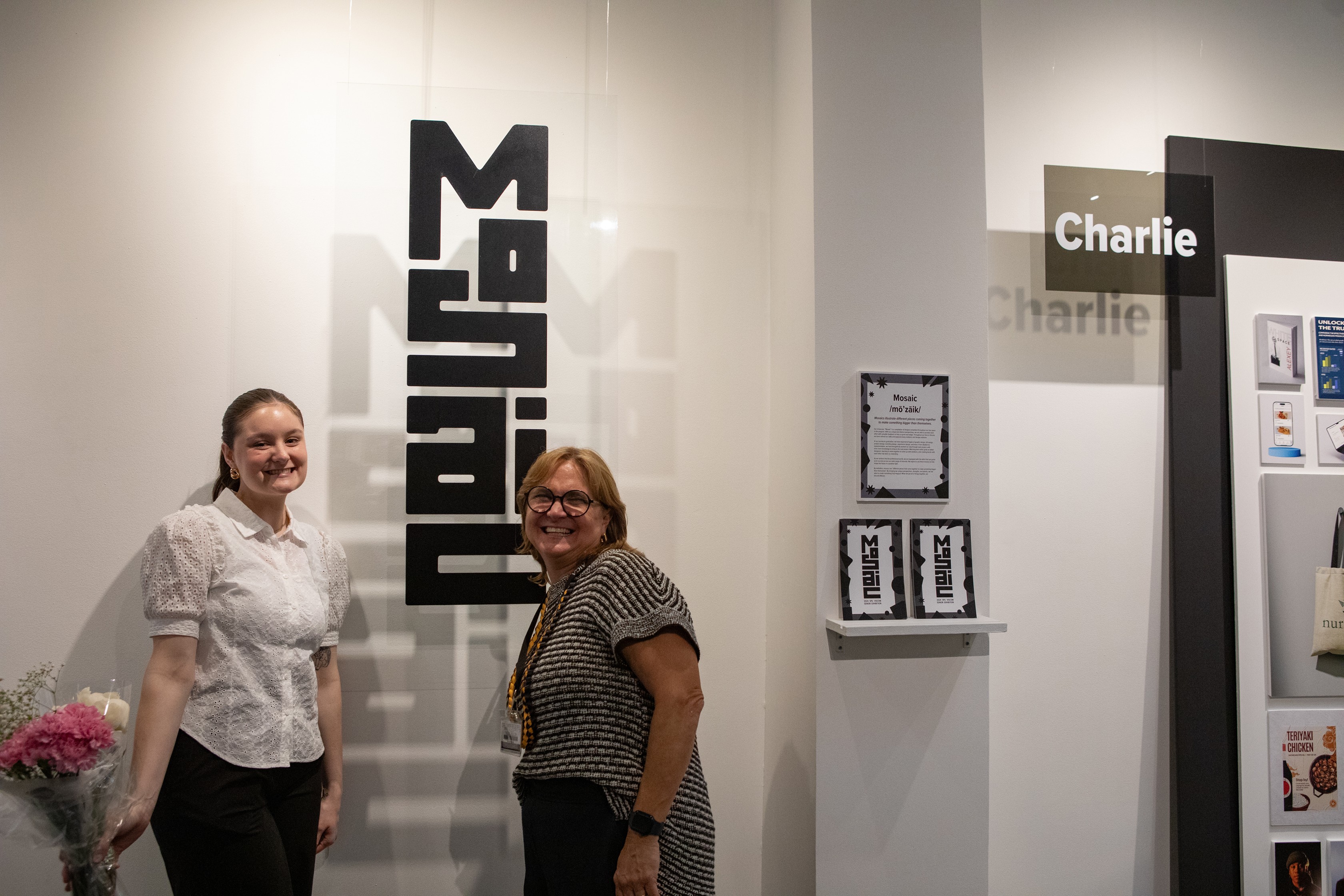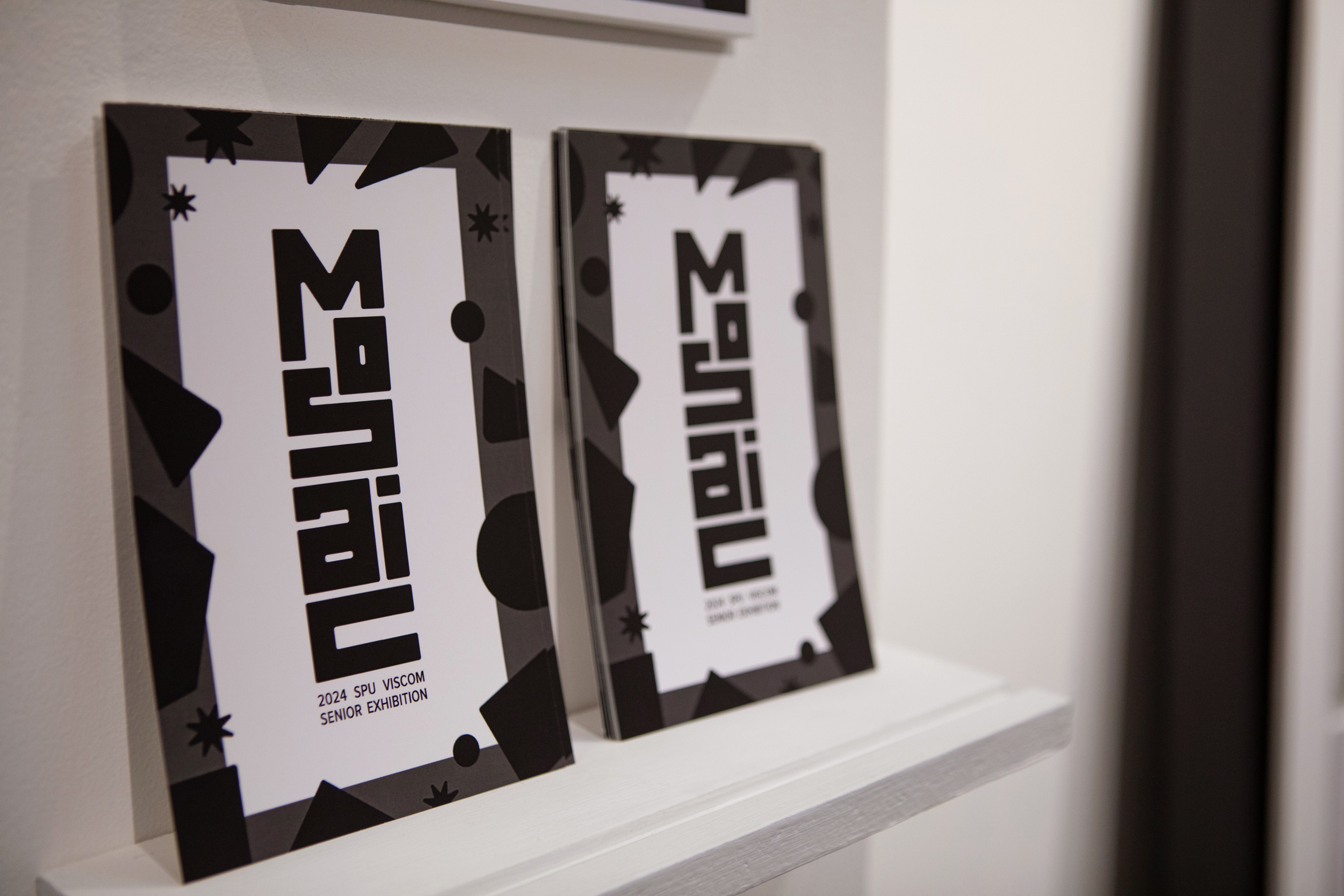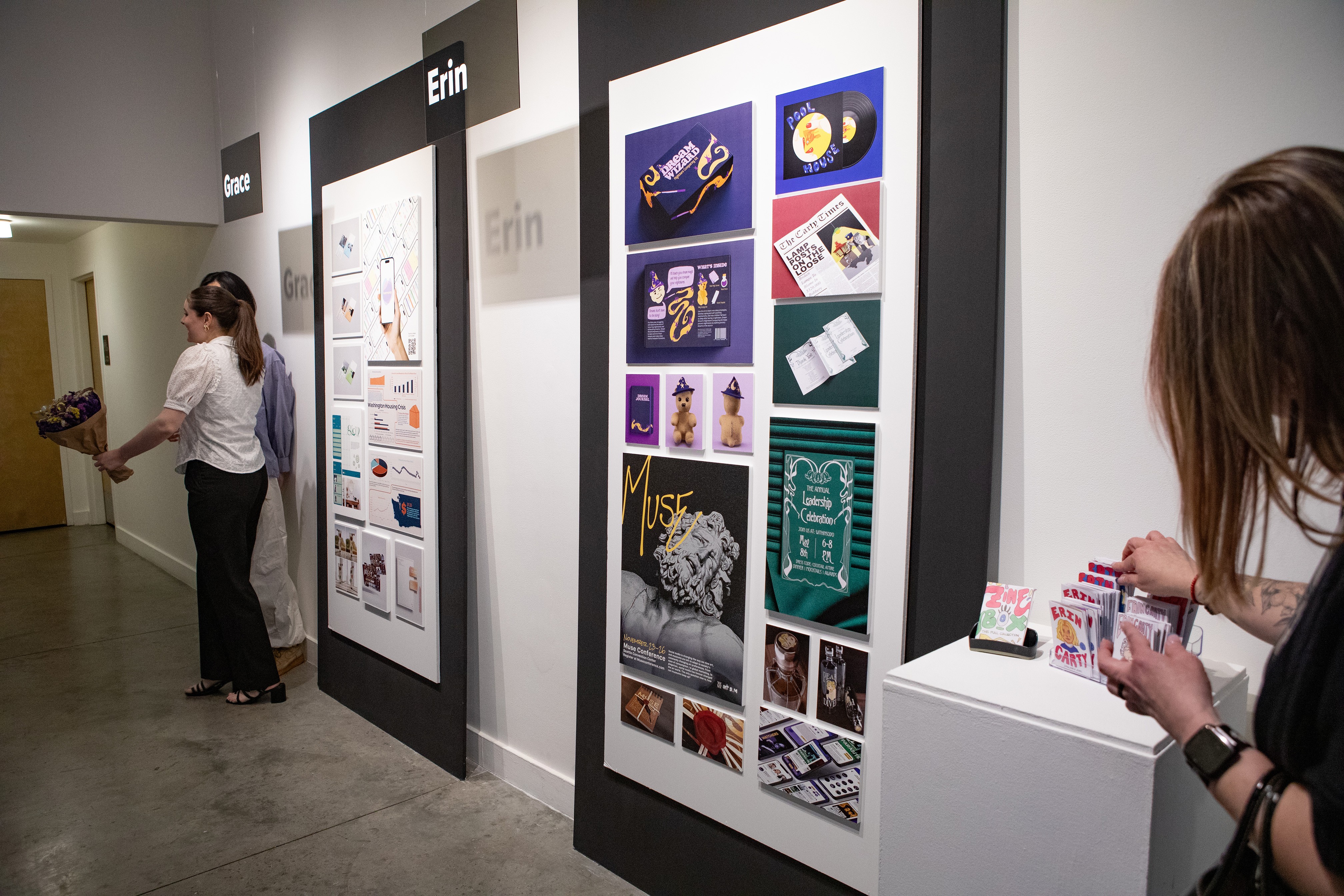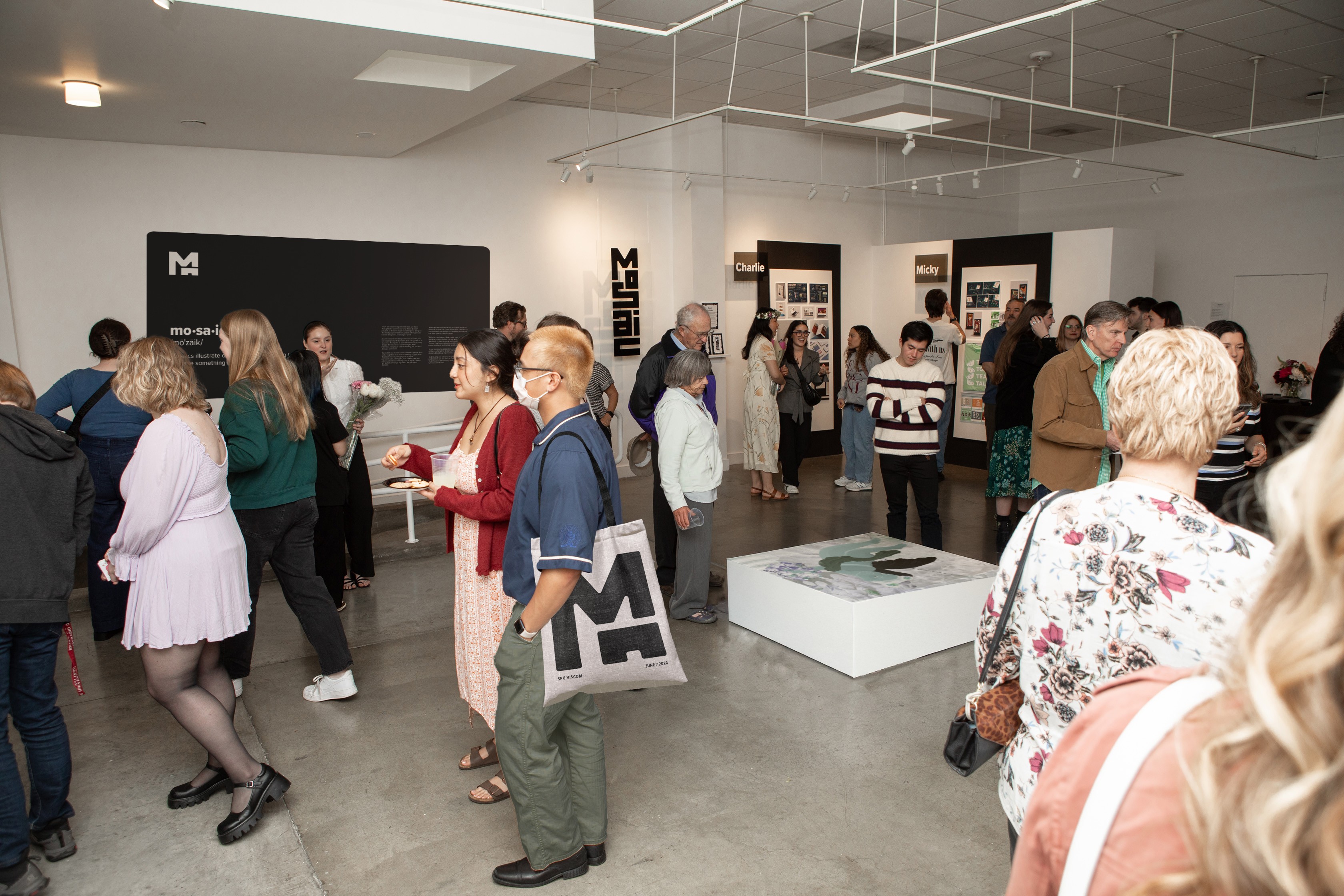 The target audience for this celebratory exhibit are family, friends, colleagues, alums, and professors of the Seattle Pacific University graduates, but it was most important to design something to represent the graduating class well. One desire of our graduates was to have a more elevated exhibit design that resembled a museum. The neutral palette serves as a place for the eye to rest, allowing the colorful art and design works to be the emphasis.