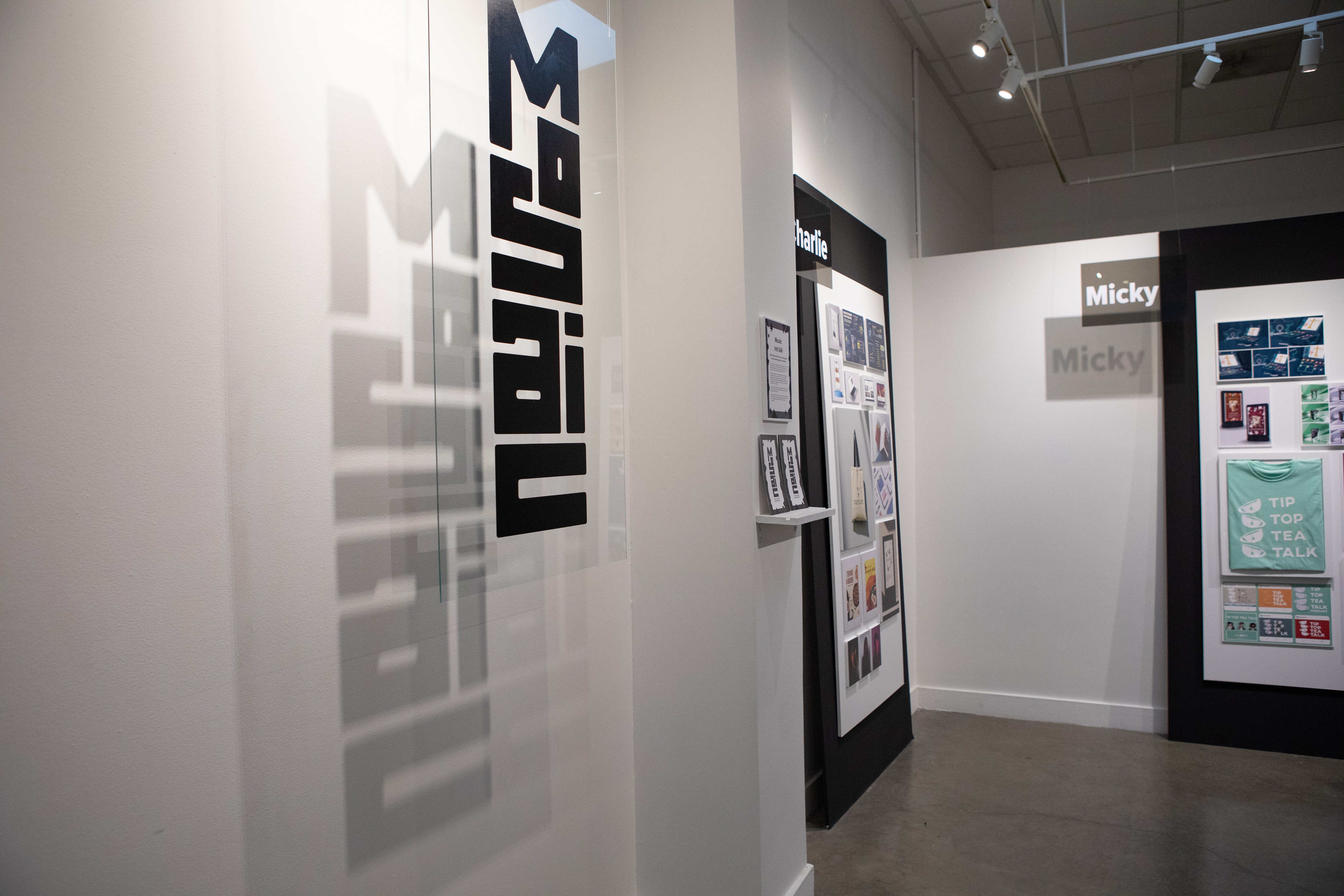 With such a neutral color palette, one opportunity to create visual interest in the exhibit was to use light for more visual interest. Instead of traditional signage that is flush to the wall, the transparent vinyl signs are hung to display a shadow on the walls.